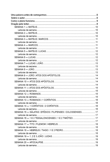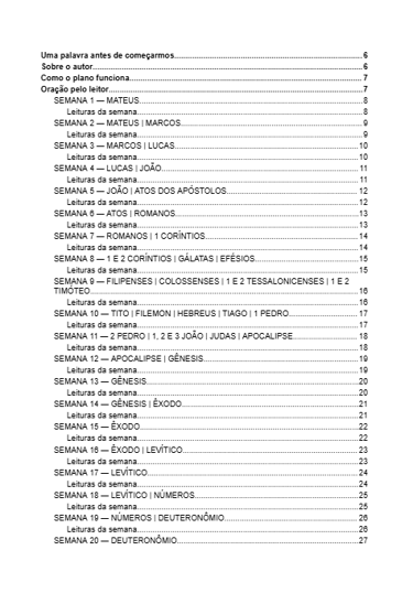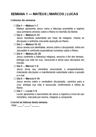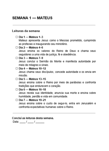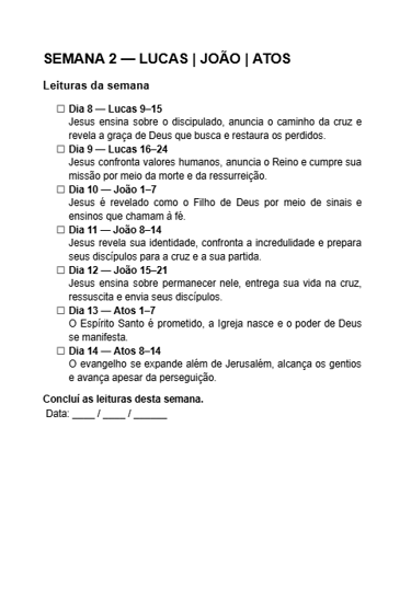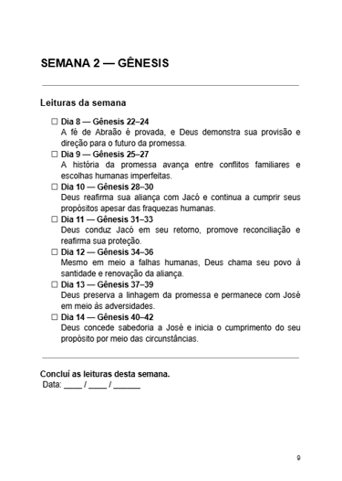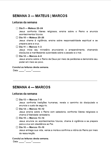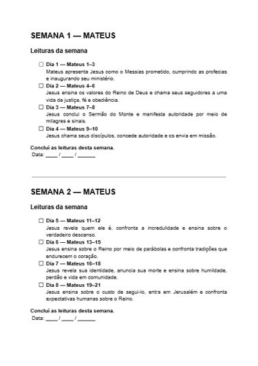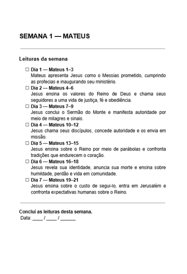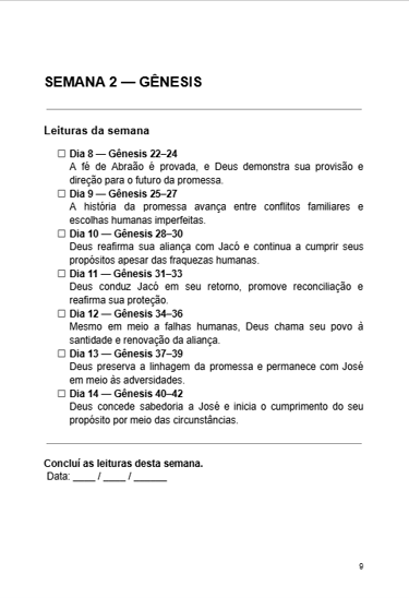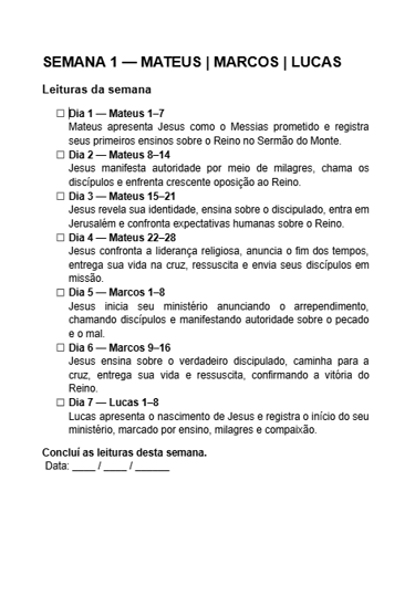 Organizado em 104 semanas, com 4 dias de leitura por semana e 3 dias livres.