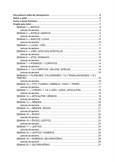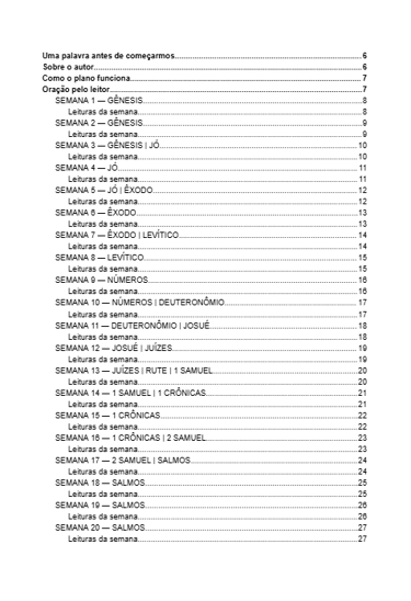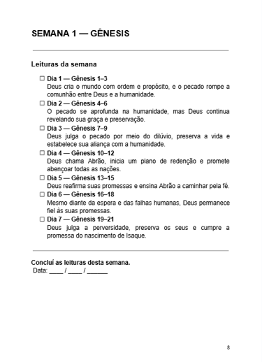 Organizado em 181 dias, distribuídos em 26 semanas, com leituras diárias.