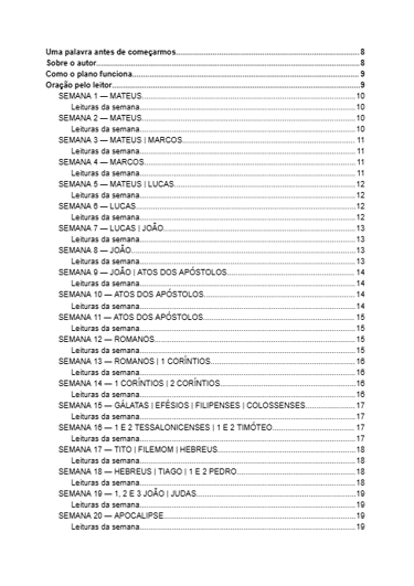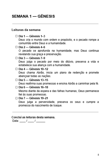 Organizado em 365 dias, distribuídos em 52 semanas, com leituras diárias.